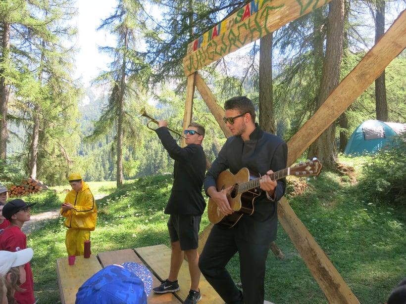 Um 08.40 Uhr besammelte sich die Jungwacht Brunnen für das Sommerlager beim Bahnhof Brunnen. Nach einer fünfstündigen Anreise mit dem ÖV kamen wir in Sta. Maria an. Mit dabei war auch Mr. Music, welcher uns durch das ganze Open Air Sta. Maria begleiten wird. Auf dem Lagerplatz erwartete uns bereits ein Erfrischungsbuffet der Küche. Danach bauten wir unsere Schlafzelte auf. Beim Popcorngame am Abend konnten wir uns bereits ein erstes Mal austoben.